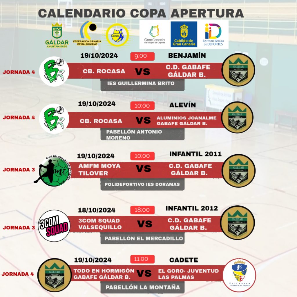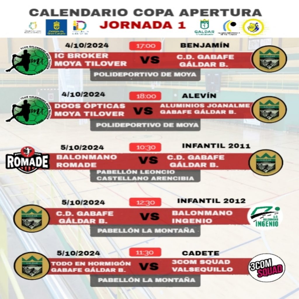 Anuncio: Segunda Jornada de la Copa Apertura de GABAFE Gáldar Balonmano 🏆 ¡Atención a todos los aficionados del balonmano! Esta semana, nuestro club GABAFE Gáldar Balonmano celebrará la segunda jornada de la Copa Apertura. Será una jornada emocionante donde participarán todas nuestras categorías, desde las más pequeñas hasta las jóvenes cadetes Ven a apoyar a…